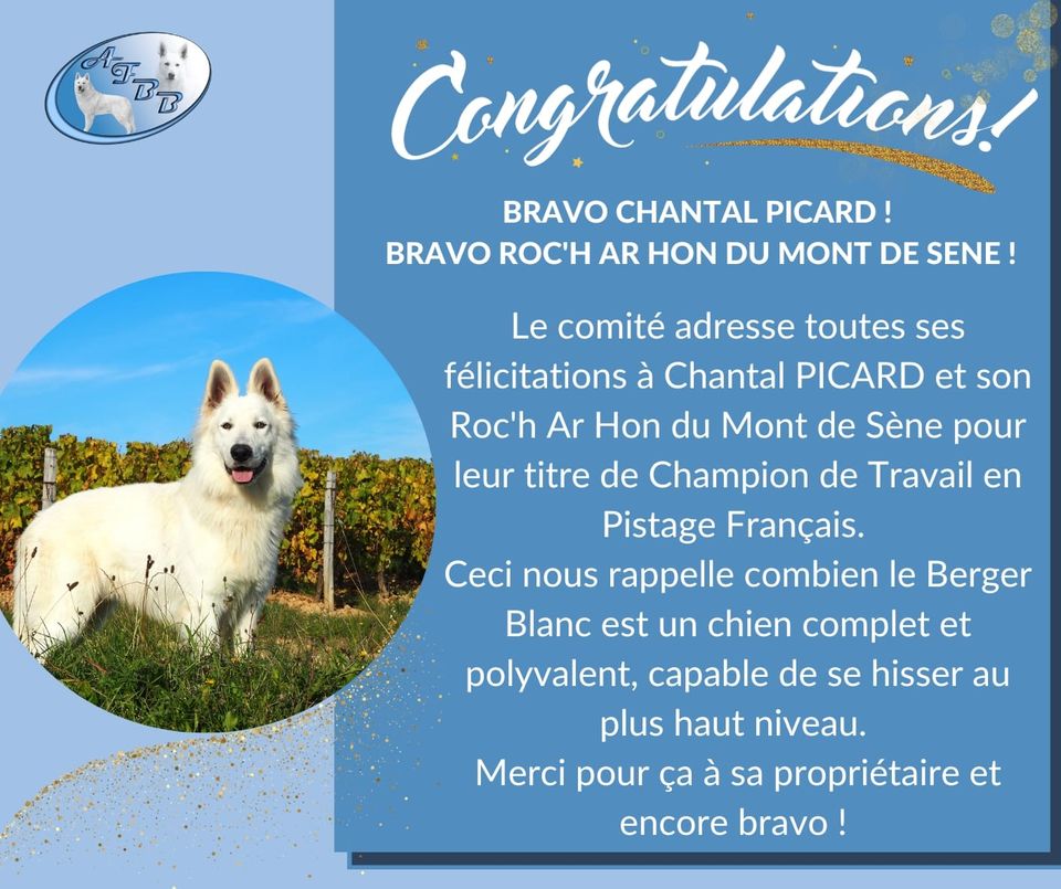 En savoir plus ********** Résultats du concours de pistage de Auxerre ![]() Roc'H Ar Hon obtient en échelon III un excellent à 189.75 pts/200. Très joli Libre à 97.75 pts ! C'est son 3ème excellent en pré-sélectifs pour la Coupe de France 2025 (il en faut 5) ********** Les félicitations du club de race pour le titre de Champion de Roc ![]() ******* Notre jeune Roc'H Ar Hon, 3 ans, obtient le titre de Champion de Travail, en Pistage Français. C'est le troisième titre de Champio de Travail obtenu par nos chiens, après Cadillac Eldorado du Mont de Sène et Tiguan Vom Sutumer Grund ![]() ********** |